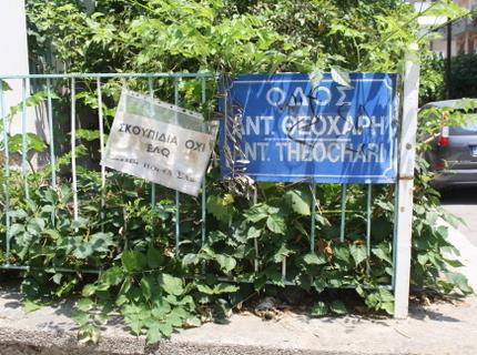 Στην οδό Θεοχάρη, όμως, ο τύπος είναι πιο μάγκας και τα λέει χύμα. "Σκουπίδια όχι εδώ. Στην πόρτα σας!" Στα μούτρα σας θα ήθελε να πει, αλλά κρατιέται ο άνθρωπος.