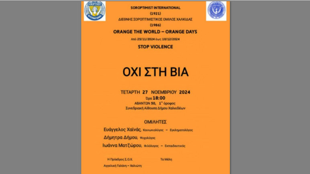 Με αφορμή την Διεθνή Ημέρα για την Εξάλειψη της Βίας κατά των Γυναικών, ο Σοροπτιμιστικός Όμιλος Χαλκίδας διοργανώνει εκδήλωση την Τετάρτη 27 Νοεμβρίου, στις 6 το απόγευμα, στη συνεδριακή αίθουσα του Δήμου Χαλκιδέων (οδός Αβάντων 50, 1ος όροφος).
