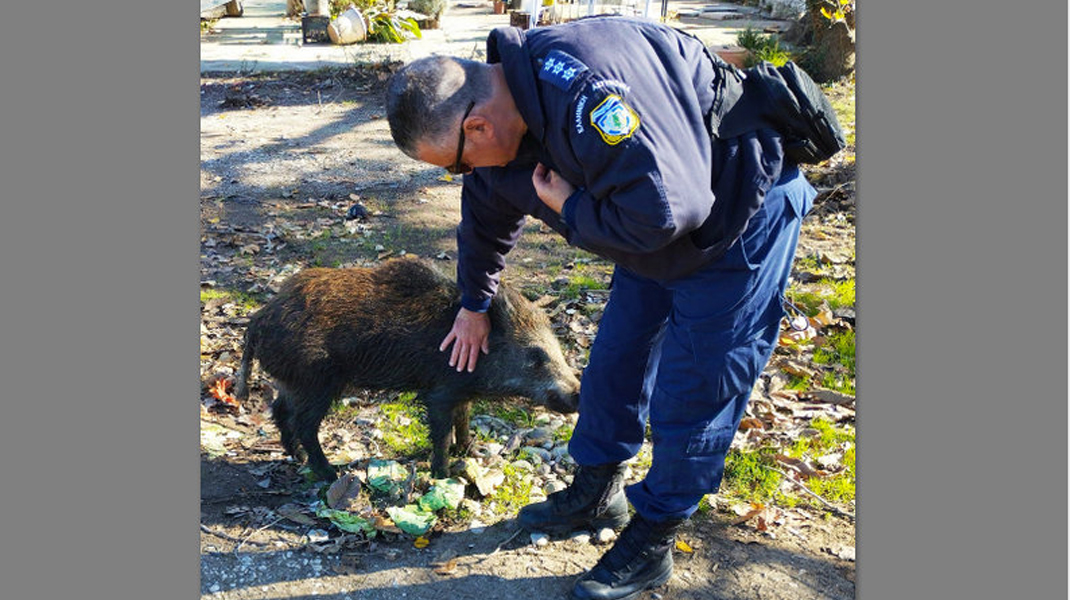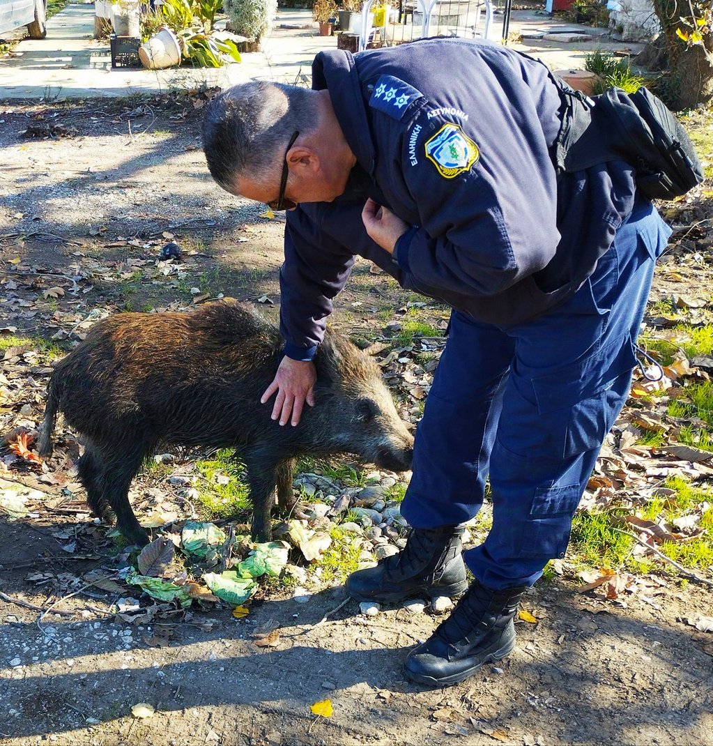 Στη φωτογραφία βλέπετε τον αξιωματικό της Αστυνομίας Νίκο Γεωργόπουλο, που υπηρετεί στη Βόρεια Εύβοια, να χαϊδεύει -σα να είναι κατοικίδιο- ένα αγριογούρουνο, στον περιβάλλοντα χώρο του Προσκυνήματος του Οσίου Ιωάννη του Ρώσου, στο Προκόπι.