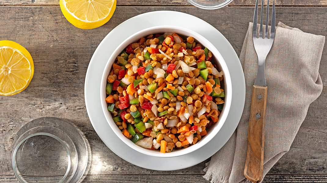 Σε ένα μεγάλο μπολ τοποθετούμε τα βρασμένα ρεβύθια, τις φακές, το κρεμμύδι και τις πιπεριές.