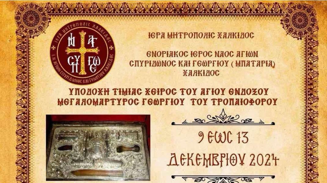 Η υποδοχή λειψάνων της Τιμίας Χειρός του Αγίου Γεωργίου του Τροπαιοφόρου θα πραγματοποιηθεί την Δευτέρα 9 Δεκεμβρίου, στις 7 το απόγευμα, στον ιερό ναό Αγίων Σπυρίδωνος και Γεωργίου, που βρίσκεται στη συνοικία Μπαταριά, στη Χαλκίδα.