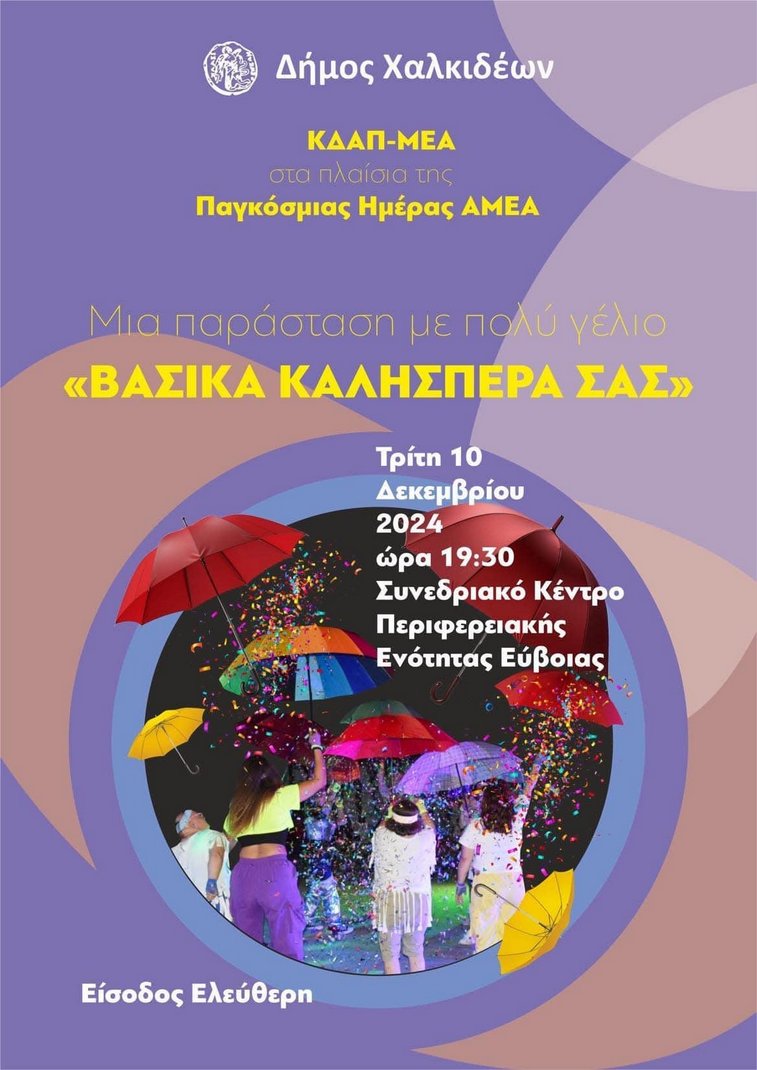 Στο πλαίσιο εορτασμού της 3ης Δεκεμβρίου-Παγκόσμιας Ημέρας Ατόμων με Αναπηρία, παρουσιάζουν πάλι την μουσικοθεατρική παράσταση «Βασικά καλησπέρα σας», την Τρίτη 10 Δεκεμβρίου, στις 7:30 το απόγευμα, στο αμφιθέατρο του μεγάρου της Περιφερειακής Ενότητας Εύβοιας (λεωφόρος Χαϊνά).