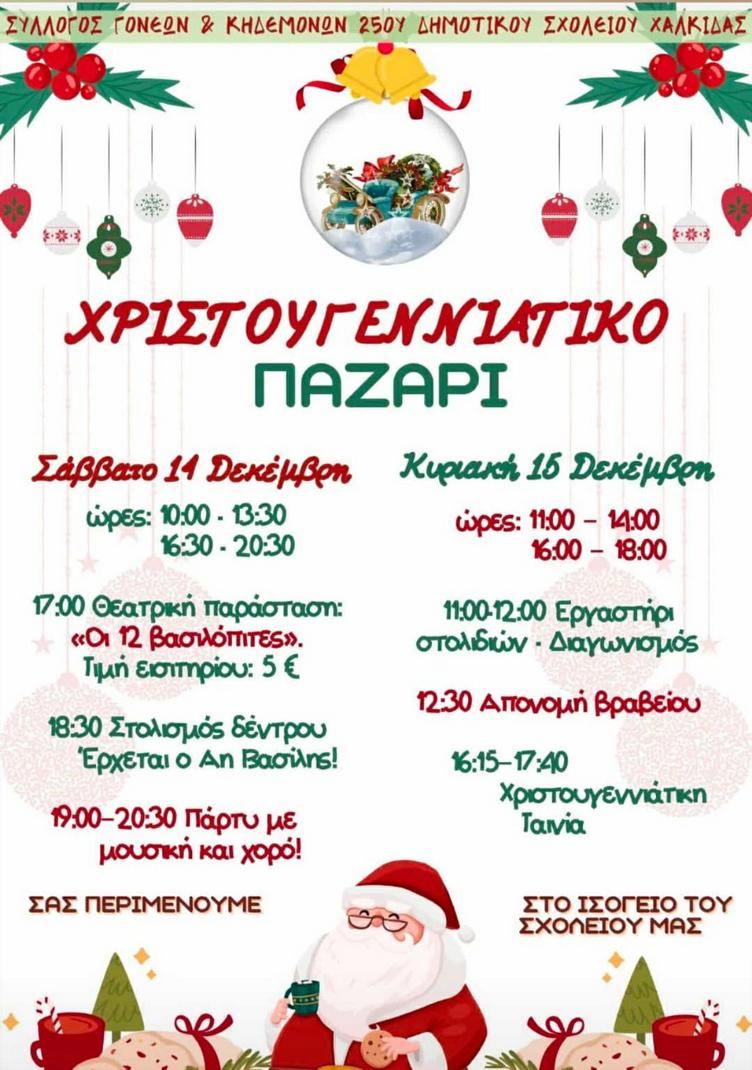 Το Σάββατο 14 και την Κυριακή 15 Δεκεμβρίου ο Σύλλογος Γονέων και Κηδεμόνων του 25ου Δημοτικού Σχολείου Χαλκίδας «Κωστής Στεφανόπουλος» διοργανώνει Χριστουγεννιάτικο Bazaar στο χώρο του σχολείου.