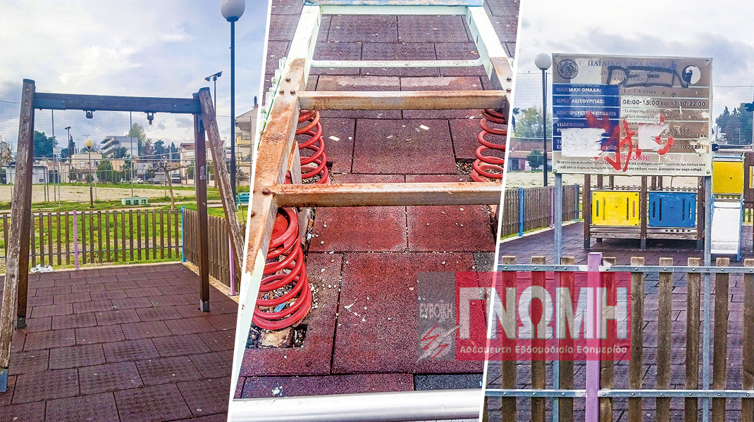 Η σπασμένη κούνια (αριστερά) και το γεμάτο σκουριά παιχνίδι αποτελούν χαρακτηριστικά παραδείγματα της εγκατάλειψης στην παιδική χαρά.