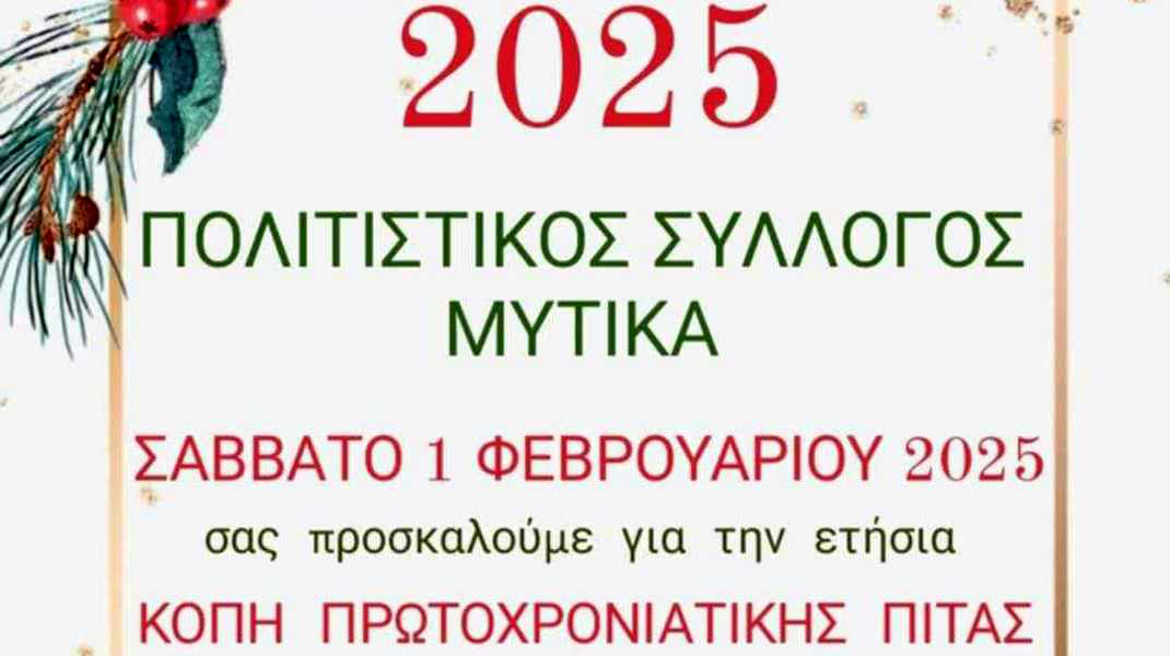 Ο Πολιτιστικός Σύλλογος Μύτικα διοργανώνει εκδήλωση, με ζωντανή μουσική, για την κοπή της πρωτοχρονιάτικης πίτας, το Σάββατο 1 Φεβρουαρίου, στις 8 το βράδυ, στην αίθουσα του Συλλόγου.