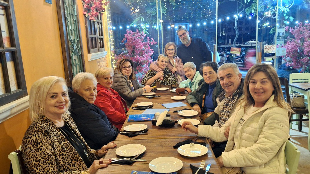 Στη φωτογραφία, βλέπετε όρθιο τον Χρήστο Κρόκο στην κορυφή του τραπεζιού, δίπλα στις κυρίες Χρυσούλα Καρέγλη και Φλώρα Σιλβέστρου.