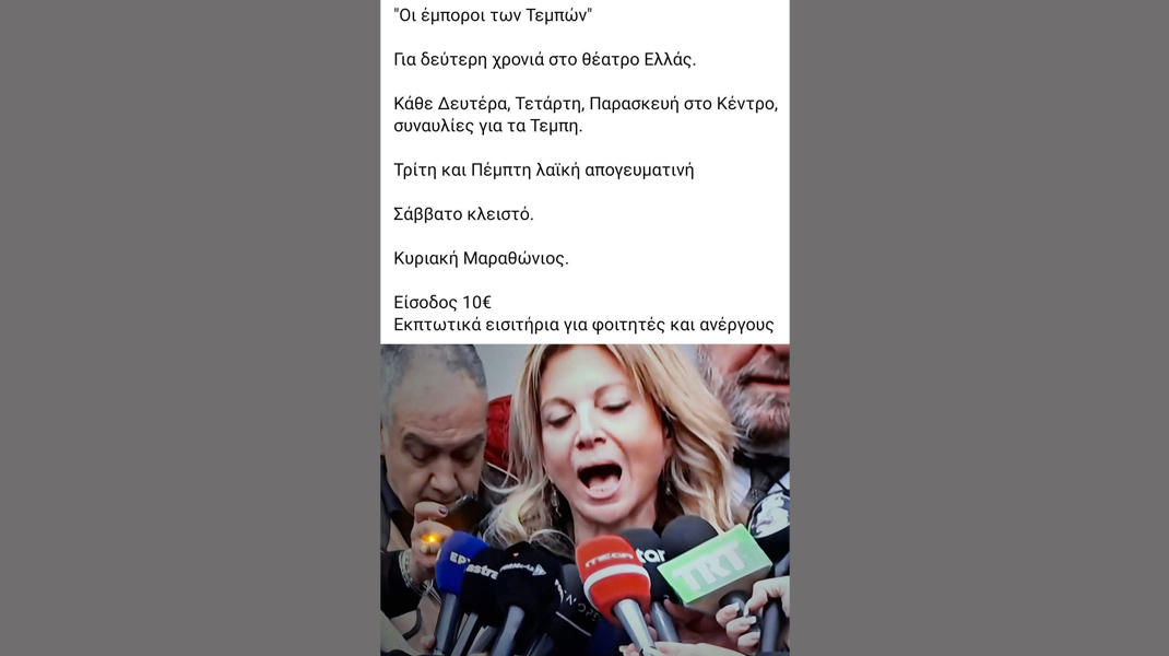 «Οι έμποροι των Τεμπών: Για δεύτερη χρονιά στο θέατρο Ελλάς. Κάθε Δευτέρα, Τετάρτη και Παρασκευή στο Κέντρο ...συναυλίες για τα Τέμπη. Τρίτη και Πέμπτη λαϊκή απογευματινή. Σάββατο κλειστό. Κυριακή Μαραθώνιος. Είσοδος 10 ευρώ. Εκπτωτικά εισιτήρια για φοιτητές και ανέργους».