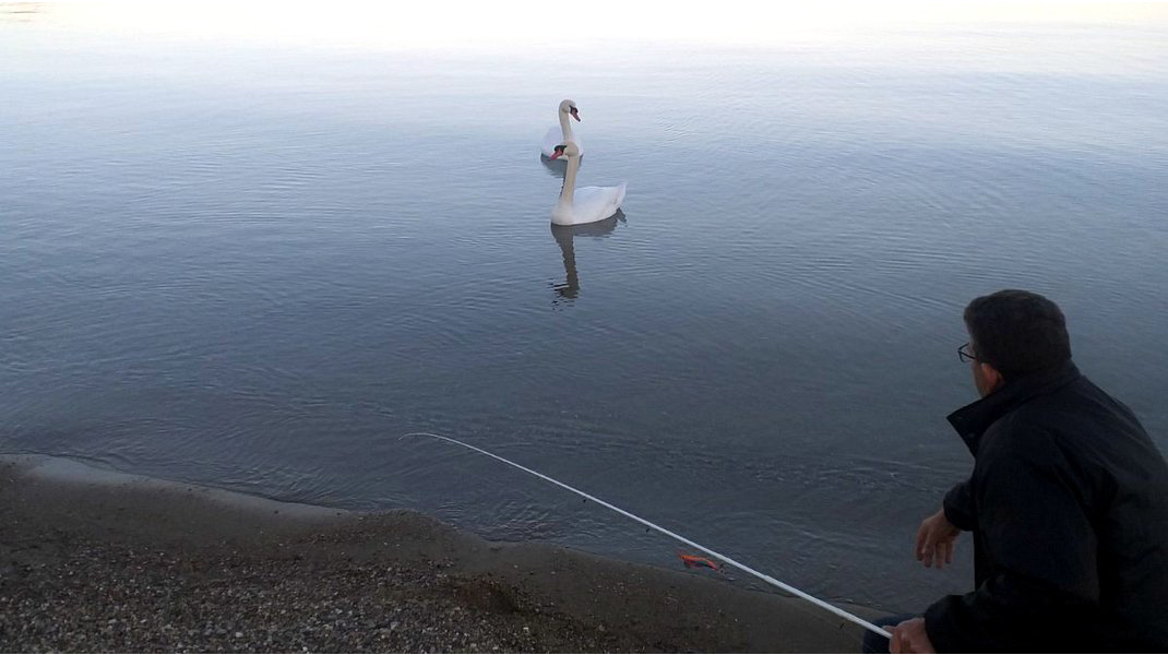 Ακόμα και οι ψαράδες σταματούν να ψαρεύουν και τους ...χαζεύουν, όπως ο Χρήστος στη φωτογραφία, ο οποίος αν και δεινός ερασιτέχνης ψαράς παράτησε το ψάρεμα για να τους θαυμάσει!.