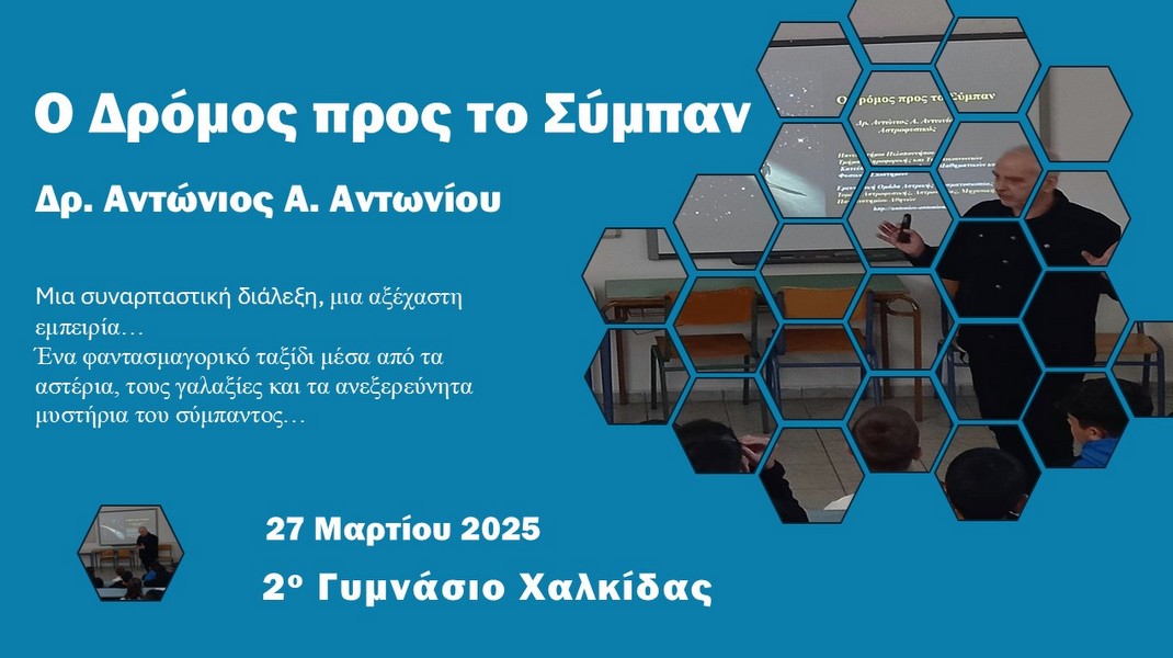 Την Πέμπτη 27 Μαρτίου, οι μαθητές του 2ου Γυμνασίου Χαλκίδας είχαν την ξεχωριστή ευκαιρία να παρακολουθήσουν μια εξαιρετικά ενδιαφέρουσα διάλεξη-συζήτηση από τον διακεκριμένο αστροφυσικό, Δρ. Αντώνιο Α. Αντωνίου, του Πανεπιστημίου Πελοποννήσου.