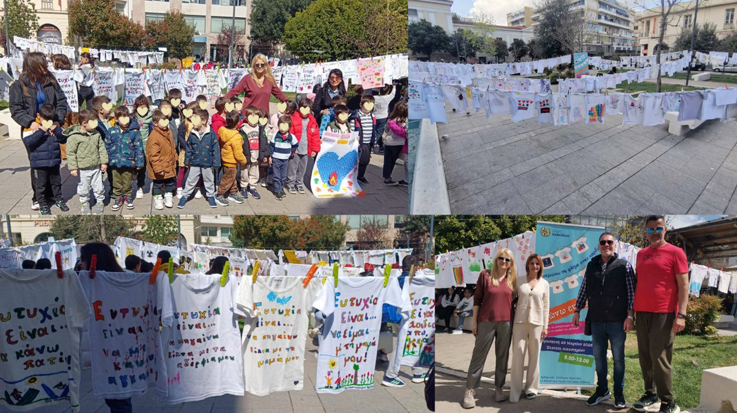 Τα παιδιά αποτύπωσαν με φαντασία και κέφι σε μπλουζάκια τι τα κάνει ευτυχισμένα ,άπλωσαν τις πρωτότυπες … μπουγάδες με τα μηνύματα τους στα σχολεία τους και έπειτα οι μπουγάδες όλων των σχολείων συγκεντρώθηκαν στην πλατεία Δικαστηρίων στέλνοντας μήνυμα αισιοδοξίας προς όλους.