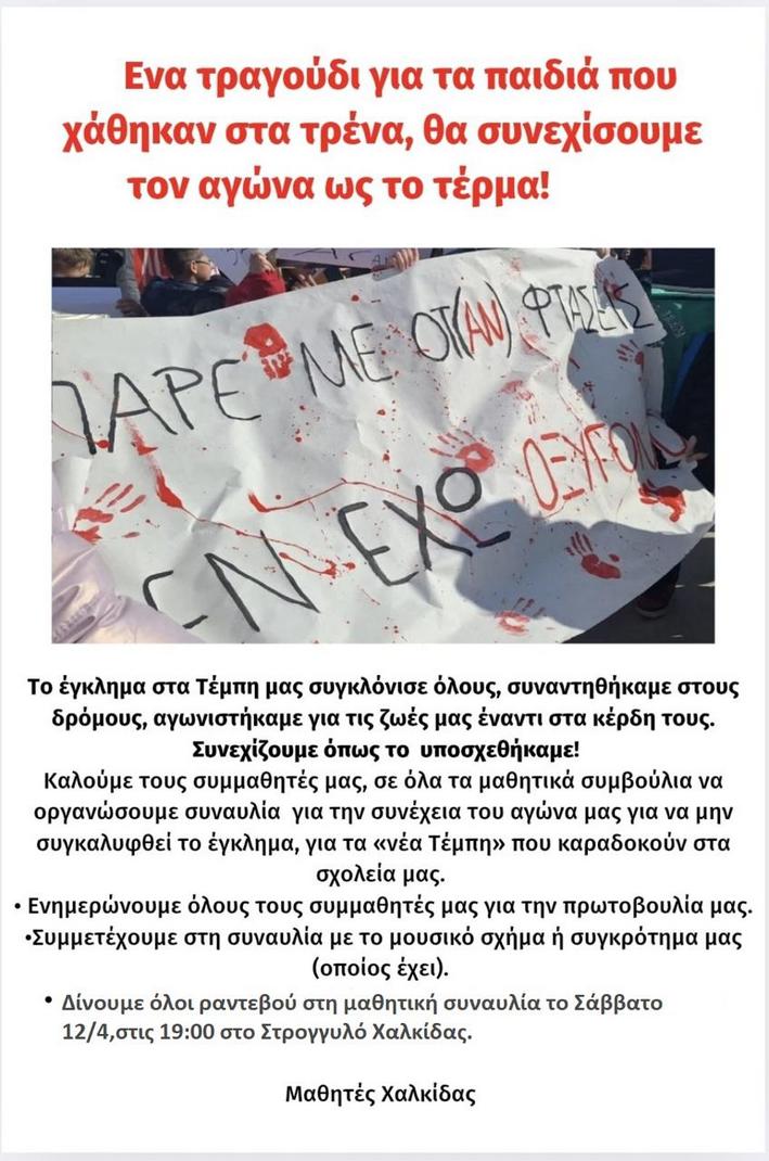 Ομάδα μαθητών της Χαλκίδας διοργανώνει συναυλία, το Σάββατο 12 Απριλίου, στις 7 το απόγευμα, στο Στρογγυλό της παραλίας Χαλκίδας, στο πλαίσιο των κινητοποιήσεων για να μην συγκαλυφθεί το "έγκλημα στα Τέμπη".