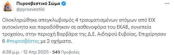 Όπως ανακοινώθηκε από την Πυροσβεστική Υπηρεσία, τροχαίο ατύχημα σημειώθηκε το μεσημέρι του Σαββάτου 12 Απριλίου, στην περιοχή Βαρβάρα Αιδηψού, κοντά στο χωριό Άγιος.