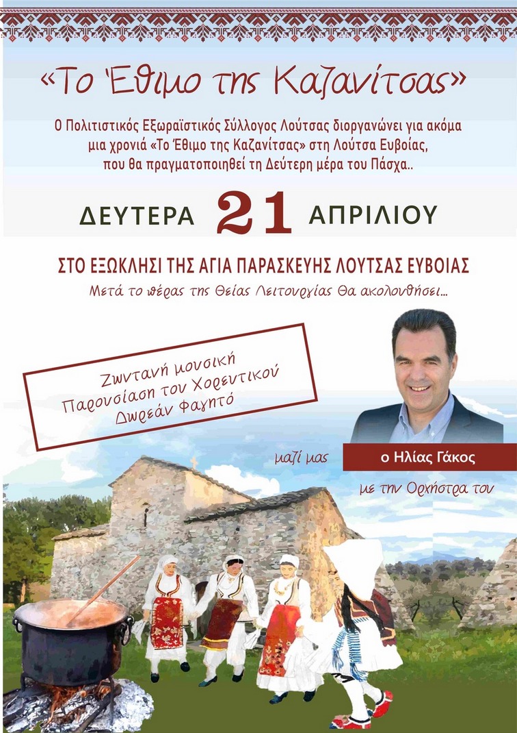 Ο Πολιτιστικός Εξωραϊστικός Σύλλογος Λούτσας, του Συλλόγου Διρφύων- Μεσσαπίων αναβιώνει το έθιμο της Καζανίτσας, την Δευτέρα του Πάσχα 21 Απριλίου, στο εκκλησάκι της Αγίας Παρασκευής.