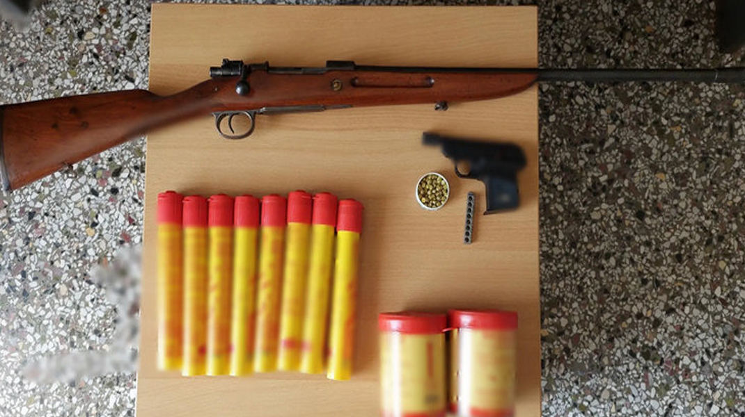 Οκτώ βεγγαλικά, δύο καπνογόνα, ένα πιστόλι εκτόξευσης φωτοβολίδων με γεμιστήρα, 85 αβολίδωτα καψύλια, καθώς και ένα τυφέκιο όπλο (λειόκαννο), στερούμενος σχετικής άδειας από την αρμόδια αρχή.