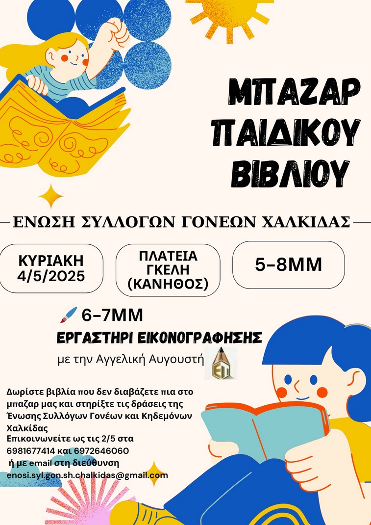 Μπαζάρ παιδικού βιβλίου διοργανώνει η Ένωση Συλλόγων Γονέων Χαλκίδας την Κυριακή 4 Μαΐου και ώρες 5-8 το απόγευμα, στην πλατεία Γκέλη, στην Κάνηθο.