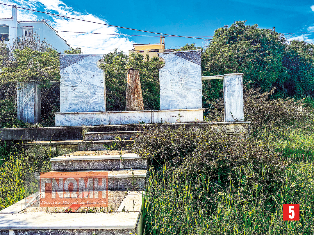 “Λαβωμένο” από την εγκατάλειψη είναι και το μνημείο πεσόντων δίπλα στην κεντρική είσοδο του γυμναστηρίου. Η εικόνα του (φωτό 5) αποτελεί ντροπή για τον καθένα και πρώτα απ’ όλους τον Αντιδήμαρχος Αθλητισμού Γιάννη Νέζη.