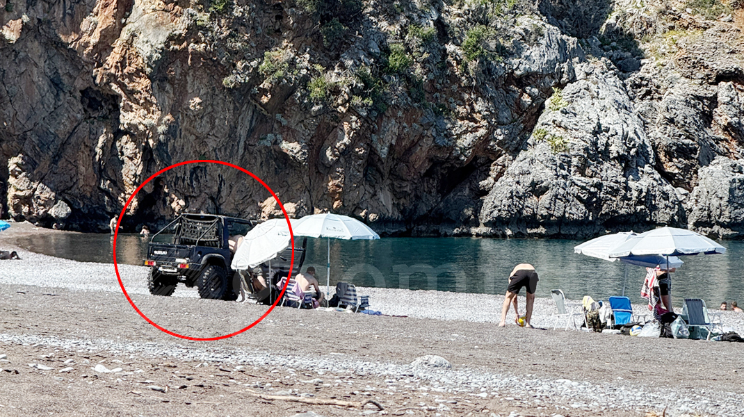 Παρέα που επέβαινε σε τζιπ εισέβαλε στον αιγιαλό, πέρασε κυριολεκτικά ανάμεσα σε λουόμενους και στάθμευσε το όχημα πάνω στην άμμο, παραβιάζοντας κατάφορα τη νομοθεσία περί προστασίας του αιγιαλού.