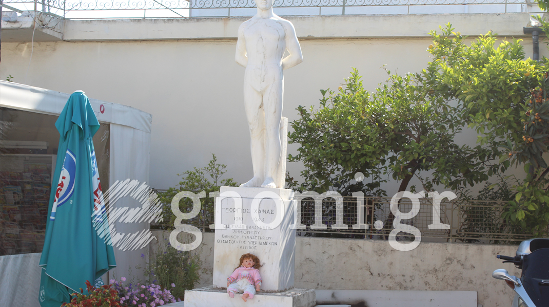 Οι κούκλες είναι για τη βιτρίνα, αλλά η συγκεκριμένη ...άραξε στο άγαλμα του Γιώργου Χαϊνά, έξω από το Δημοτικό Στάδιο Χαλκίδας.