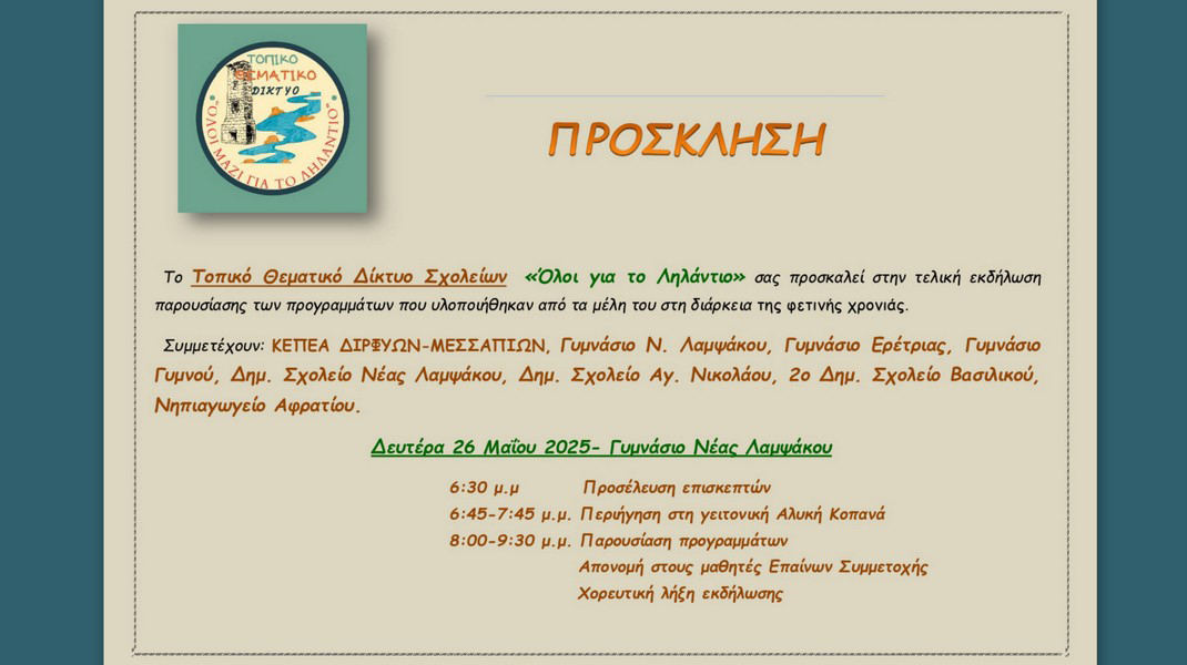 Την Δευτέρα 26 Μαΐου, στις 6:30 το απόγευμα, στο Γυμνάσιο Νέας Λαμψάκου θα πραγματοποιηθεί η τελική εκδήλωση παρουσίασης των προγραμμάτων που υλοποιήθηκαν από το Δίκτυο των επτά σχολείων