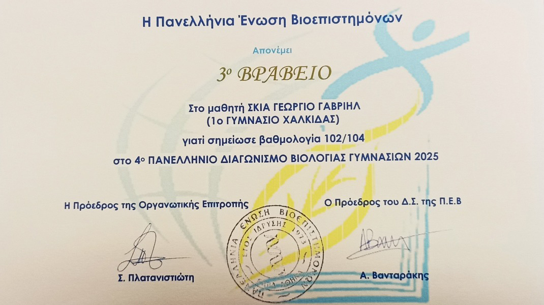 Το 1ο Γυμνάσιο Χαλκίδας συμμετείχε και φέτος στον 4ο Πανελλήνιο Διαγωνισμό Βιολογίας που απευθύνεται στην Γ' Γυμνασίου και πραγματοποιήθηκε διαδικτυακά στις 15 Μαΐου 2025.