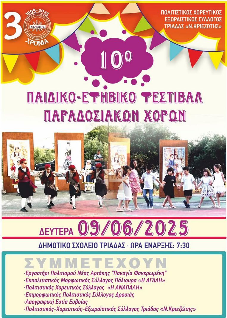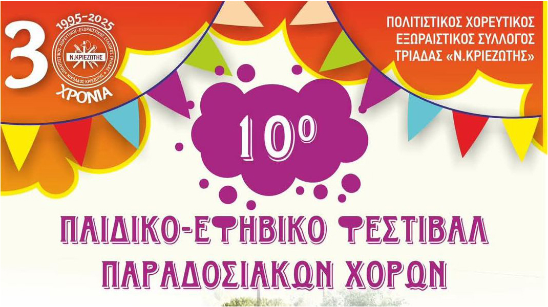 Ο Πολιτιστικός Χορευτικός Εξωραϊστικός Σύλλογος Τριάδας "Ν. Κριεζώτης" διοργανώνει σήμερα Δευτέρα 9 Ιουνίου, με ώρα έναρξης στις 7:30 το απόγευμα, παιδικό- εφηβικό φεστιβάλ παραδοσιακών χορών, στο Δημοτικό Σχολείο Τριάδας.