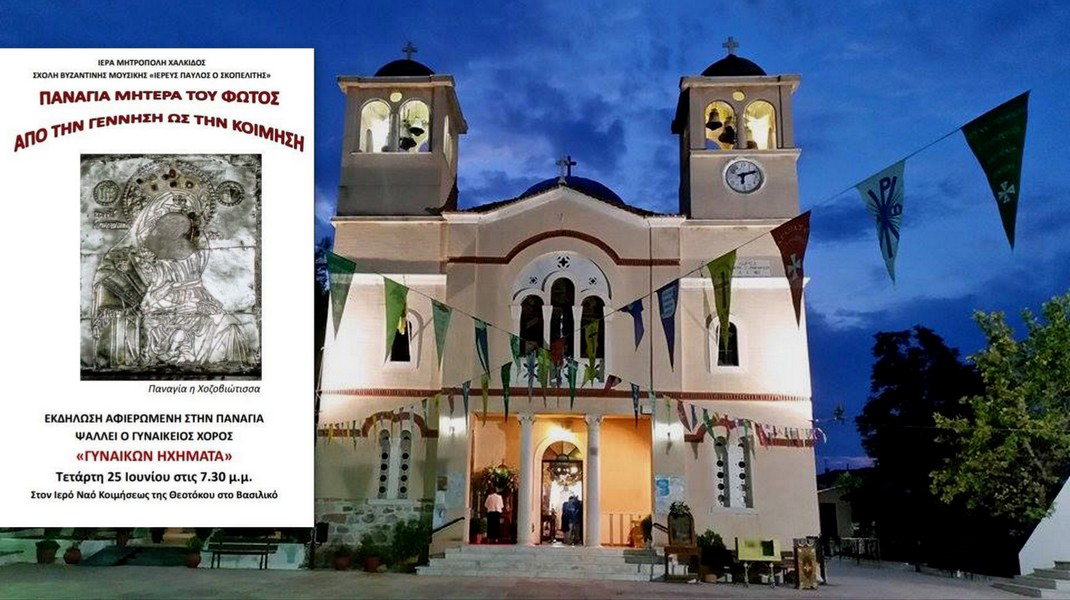 Η εκδήλωση θα πραγματοποιηθεί την Τετάρτη 25 Ιουνίου, στις 7:30 το απόγευμα, στον ιερό ναό Κοιμήσεως της Θεοτόκου, στο Βασιλικό Χαλκίδας. Πρόκειται για ένα αφιέρωμα στην Θεοτόκο που σε κάθε κύκλο της ζωής μας, από τη γέννηση ως τον θάνατο, είναι σκέπη, καταφυγή και οδηγός μας.