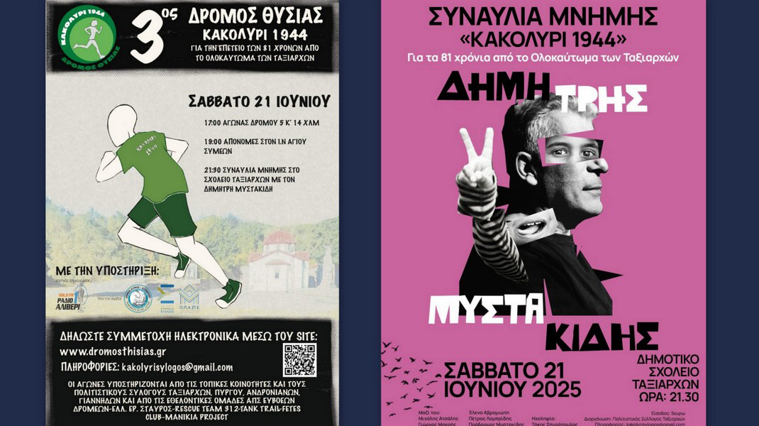 Οι εκδηλώσεις μνήμης για τα 81 Χρόνια από το Ολοκαύτωμα των Ταξιαρχών συνεχίζονται το Σάββατο 21 Ιουνίου με τον 3ο Δρόμο Θυσίας «Κακολύρι 1944» και συναυλία με τον Δημήτρη Μυστακίδη.