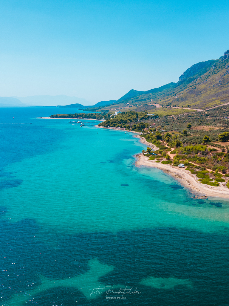 Κατά μήκος απλώνεται η παραλία των Γιάλτρων με τα καταγάλανα νερά και πράσινο που φτάνει μέχρι τη θάλασσα (φωτό κάτω).