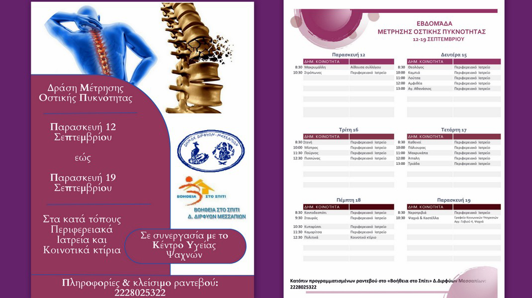 Το «Βοήθεια στο σπίτι», του Δήμου Διρφύων Μεσσαπίων, στο πλαίσιο εφαρμογής προγραμμάτων προληπτικής ιατρικής, διοργανώνει από τις 12 έως και τις 19 Σεπτεμβρίου δράση δωρεάν προληπτικού ελέγχου για την οστεοπόρωση, όπου περιλαμβάνει μέτρηση οστικής πυκνότητας με υπέρηχο πτέρνας.