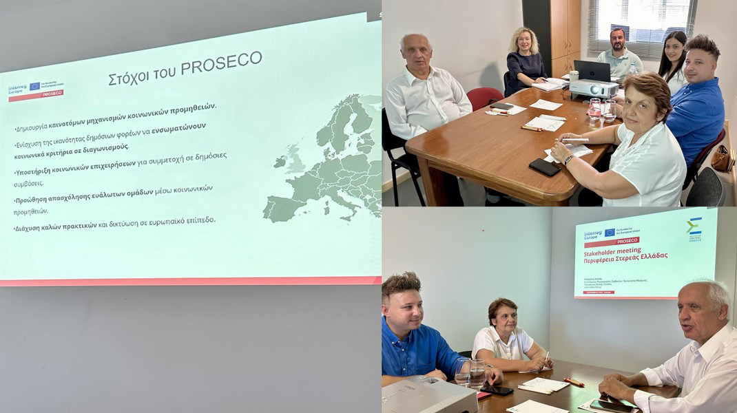 Στο πλαίσιο του νέου ευρωπαϊκού έργου Interreg Europe της Περιφέρειας Στερεάς Ελλάδας με τίτλο "PROSECO (Promoting Social Procurement in European Regions and Cities)", την Τρίτη 2 Σεπτεμβρίου, έλαβε χώρα στο Διοικητήριο της Περιφερειακής Ενότητας Εύβοιας στη Χαλκίδα, συνάντηση εργασίας με συμμετοχική συζήτηση (stakeholders meeting).