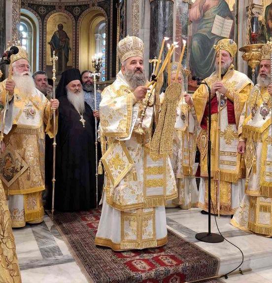 Της Θείας Λειτουργίας προεξήρχε ο Μακαριώτατος Αρχιεπίσκοπος Αθηνών και πάσης Ελλάδος κ. Ιερώνυμος, συμπαραστατούμενος από τους Μητροπολίτες Δημητριάδος και Αλμυρού κ. Ιγνάτιο, Χαλκίδος κ. Χρυσόστομο, Μεσσηνίας κ. Χρυσόστομο, Νέας Ιωνίας, Φιλαδελφείας, Ηρακλείου και Χαλκηδόνος κ. Γαβριήλ, Ιερισσού, Αγίου Όρους και Αρδαμερίου κ. Θεόκλητο, Θεσσαλιώτιδος και Φαναριοφερσάλων κ. Τιμόθεο, Θήρας, Αμοργού και Νήσων κ. Αμφιλόχιο, Γόρτυνος και Μεγαλοπόλεως κ. Νικηφόρο, Παραμυθίας, Φιλιατών και Γηρομερίου κ. Σεραπίωνα και τον Θεοφιλέστατο Επίσκοπο Σκοπέλου κ. Νικόδημο. Επίσης, εκκλησιάστηκαν πολλοί άλλοι Αρχιερείς.