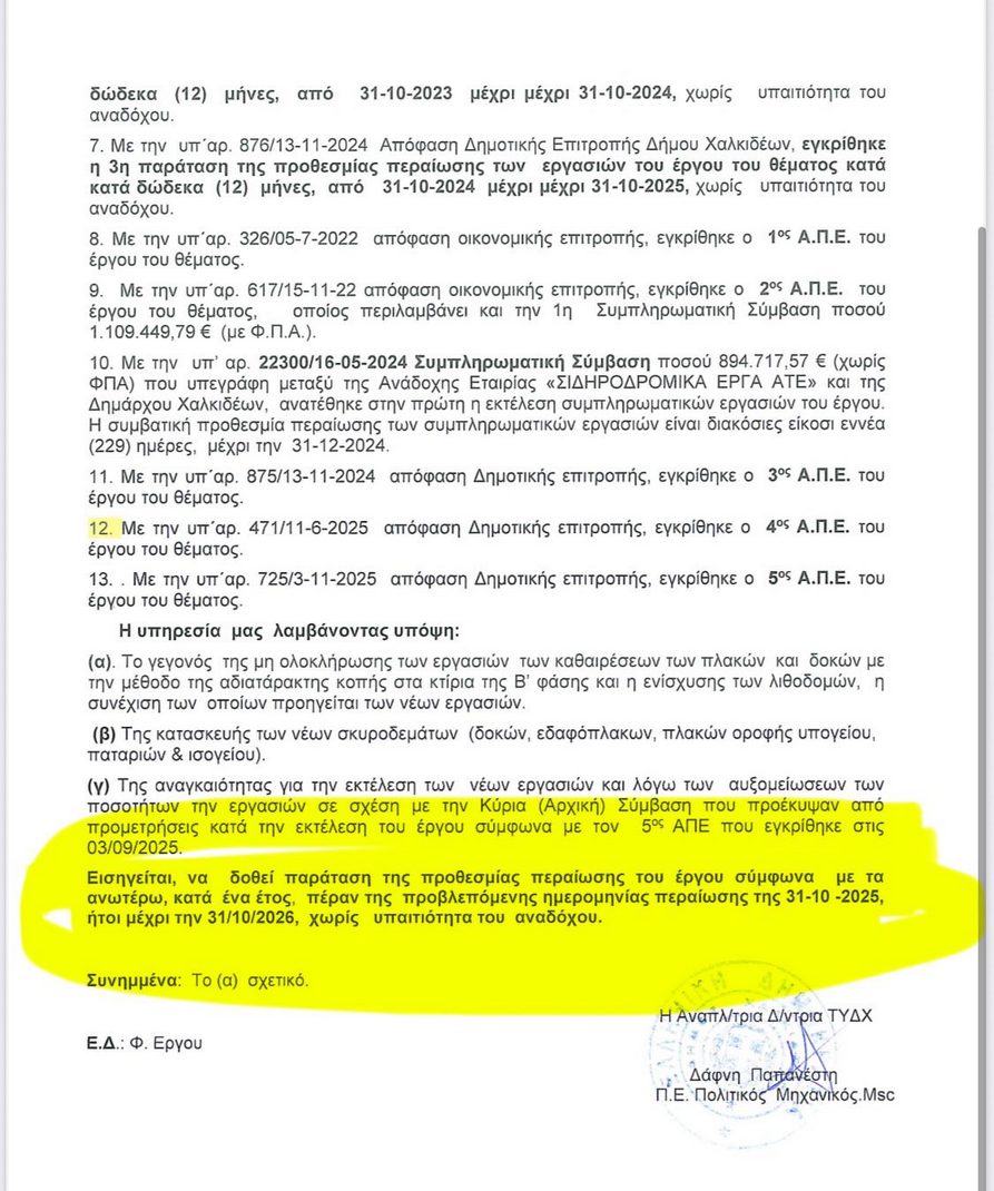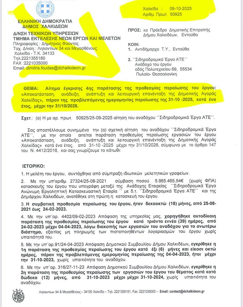 Σύμφωνα με το έγγραφο της Διεύθυνσης Τεχνικών Υπηρεσιών (9/10/2025), προς την Δημοτική Επιτροπή του Δήμου Χαλκιδέων, ζητείται νέα παράταση ενός έτους για την ολοκλήρωση του έργου της Δημοτικής Αγοράς Χαλκίδας.
