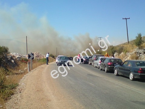 Σύμφωνα με πληροφορίες αυτοπτών μαρτύρων, επικρατεί ένας πανικός στην περιοχή και η φωτιά κινείται προς Τραχήλι. Η κυκλοφορία στο δρόμο έχει διακοπεί (φωτό αριστερά). Ωστόσο, το έργο της κατάσβεσης δυσχεραίνουν αφάνταστα οι ισχυροί άνεμοι που πνέουν στην Ακτή.