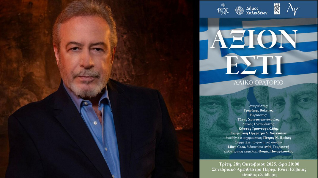 Ανήμερα της Εθνικής Εορτής, την Τρίτη 28 Οκτωβρίου, στις 8 το βράδυ, στο αμφιθέατρο της Περιφερειακής Ενότητας Εύβοιας, στη Χαλκίδα, θα παρουσιαστεί το " Άξιον Εστί", σε ποίηση Οδυσσέα Ελύτη και σύνθεση Μίκη Θεοδωράκη.