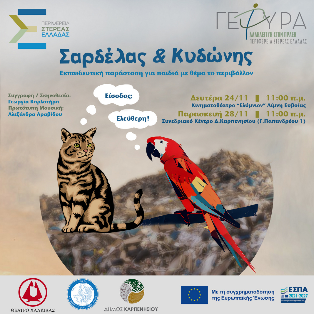 Με αφορμή την Παγκόσμια Ημέρα Θεάτρου στην Εκπαίδευση (27 Νοεμβρίου), η Περιφέρεια Στερεάς Ελλάδας και το Περιφερειακό Παρατηρητήριο Κοινωνικής Ένταξης – Δομή «Γέφυρα», παρουσιάζουν την πρωτότυπη παιδική παράσταση «Σαρδέλας και Κυδώνης».
