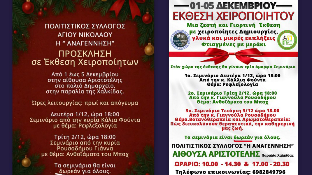Ο Πολιτιστικός Σύλλογος Αγίου Νικολάου (Μπούρτζι) του Δήμου Χαλκιδέων διοργανώνει έκθεση χειροποίητων ειδών, από 1-5 Δεκεμβρίου στην αίθουσα "Αριστοτέλης", του Μεγάρου Κότσικα, στην παραλία της Χαλκίδας.