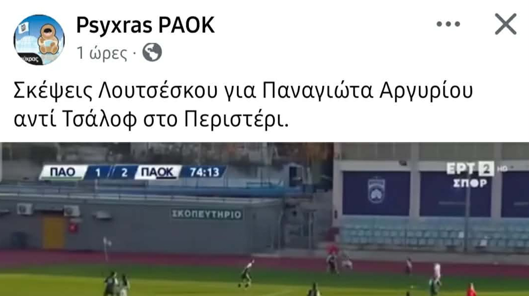 Ακόμη, χθες το απόγευμα, λίγο πριν τη σέντρα στον αγώνα της Super League Ατρόμητος-ΠΑΟΚ στο Περιστέρι, η δημοφιλέστερη σελίδα του ΠΑΟΚ στο Fecebook με την επωνυμία "Psyxras PAOK" έγραψε χαρακτηριστικά "σκέψεις Λουτσέσκου για Παναγιώτα Αργυρίου αντί Τσάλοφ στο Περιστέρι".
