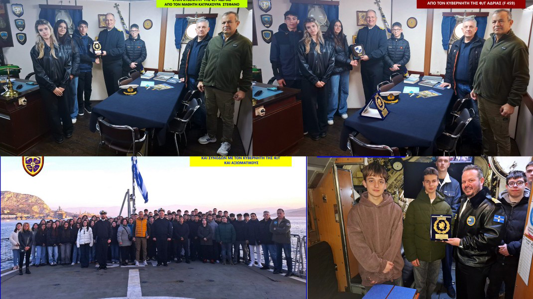 Οι μαθητές ξεναγήθηκαν στη φρεγάτα ΑΔΡΙΑΣ (F 459), όπου τους υποδέχθηκαν ο Κυβερνήτης Αντιπλοίαρχος ΠΝ Ιωάννης Νέλλας και ο Ύπαρχος του πλοίου.