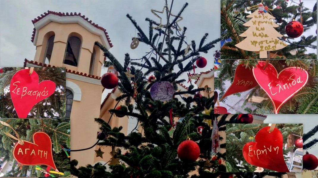 Τα παιδιά, με τη συνοδεία εκπαιδευτικών και γονέων, στόλισαν το δέντρο με χειροποίητες κάρτες, γράφοντας μηνύματα αγάπης, ειρήνης και αισιοδοξίας.