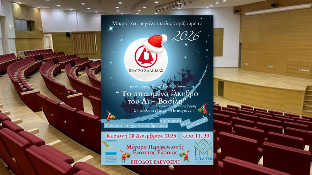 Η μαγεία των Χριστουγέννων ζωντανεύει στην καρδιά της Χαλκίδας με το παραμύθι «Το σπασμένο έλκηθρο του Άι Βασίλη», την Κυριακή 28 Δεκεμβρίου, στις 11:30 το πρωί, στο Αμφιθέατρο της Περιφερειακής Ενότητας Εύβοιας. Η είσοδος είναι ελεύθερη για μικρούς και μεγάλους.