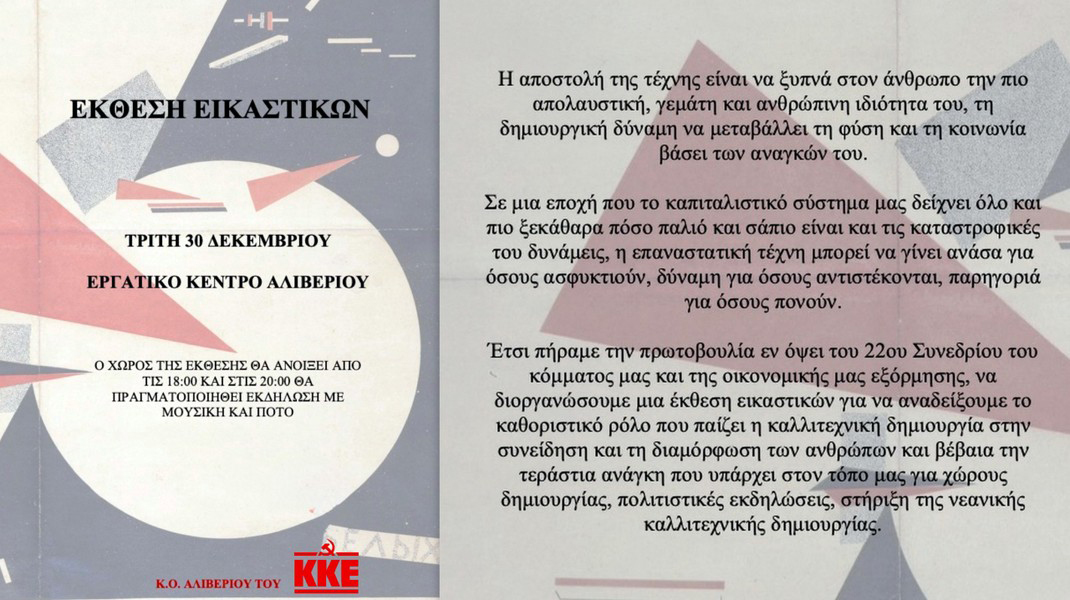 Η Κομματική Οργάνωση Αλιβερίου του ΚΚΕ διοργανώνει την Τρίτη 30 Δεκεμβρίου έκθεση εικαστικών έργων από την . Ο χώρος της έκθεσης θα ανοίξει για το κοινό στις 6 το απόγευμα, στο Εργατικό Κέντρο Αλιβερίου.
