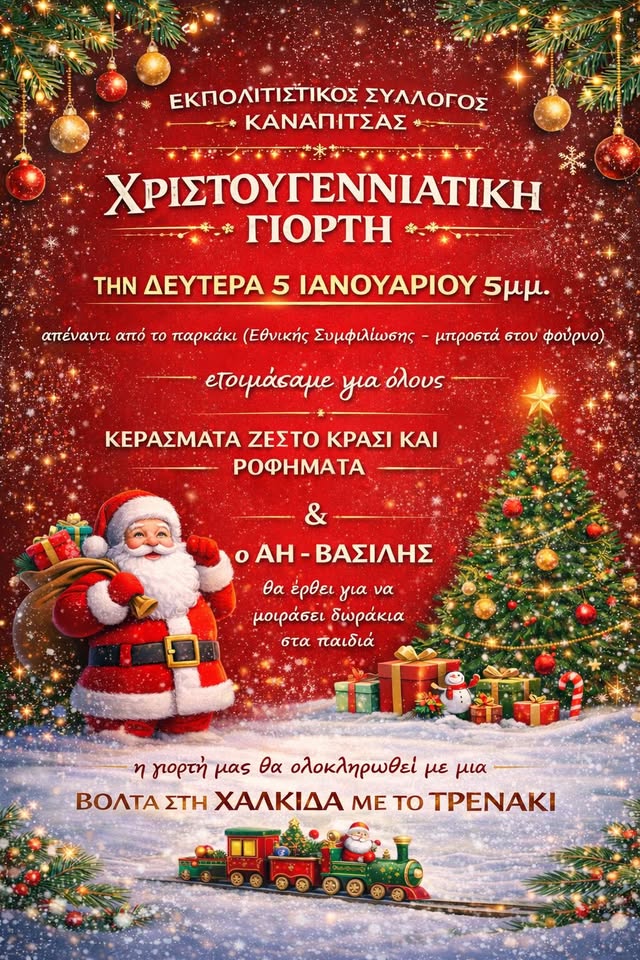 Ο Εκπολιτιστικός Σύλλογος Καναπίτσας διοργανώνει μια μοναδική Χριστουγεννιάτικη γιορτή που θα ζωντανέψει το παρκάκι της οδού Εθνικής Συμφιλίωσης, την Δευτέρα 5 Ιανουαρίου, στις 5 το απόγευμα.