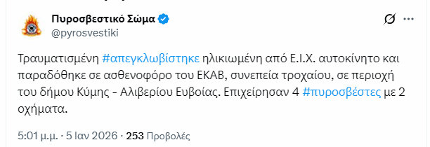 Τροχαίο ατύχημα σημειώθηκε το απόγευμα της Δευτέρας 5 Ιανουαρίου, σε περιοχή του Δήμου Κύμης – Αλιβερίου, στην Εύβοια, με αποτέλεσμα τον τραυματισμό ηλικιωμένης γυναίκας.