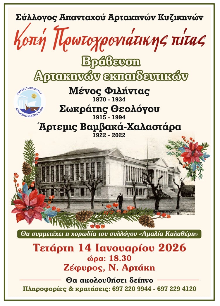 Ο Σύλλογος Αρτακηνών - Κυζικηνών διοργανώνει φέτος μία ξεχωριστή εκδήλωση, για την κοπή της πρωτοχρονιάτικης πίτας, στο πλαίσιο της οποίας θα τιμηθούν τρεις Αρτακηνοί εκπαιδευτικοί για το έργο τους και την συμβολή τους στα ελληνικά γράμματα και στον τόπο τους.