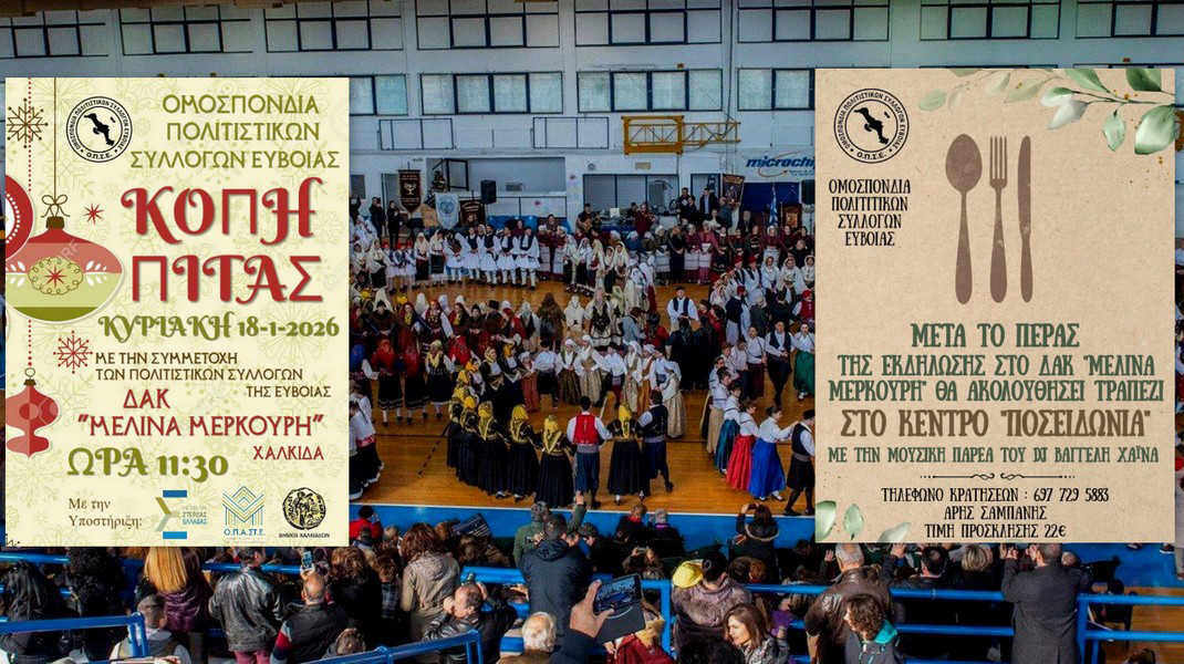 Η Ομοσπονδία Πολιτιστικών Συλλόγων Ευβοίας (Ο.Π.Σ.Ε.) διοργανώνει για ακόμα μία χρονιά την καθιερωμένη εκδήλωση για την κοπή της πίτας, την Κυριακή 18 Ιανουαρίου, στις 11:30 το πρωί, στο ΔΑΚ «Μελίνα Μερκούρη», στην Χαλκίδα.