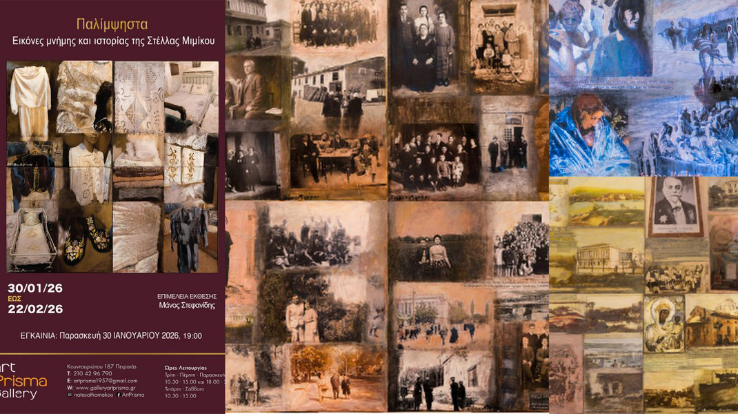 Την Παρασκευή 30 Ιανουαρίου, στις 7 το απόγευμα, θα πραγματοποιηθούν τα εγκαίνια της ατομικής έκθεσης της Στέλλας Μιμίκου με τίτλο «ΠΑΛΙΜΨΗΣΤΑ – Εικόνες μνήμης και ιστορίας», στην γκαλερί "Art Prisma".
