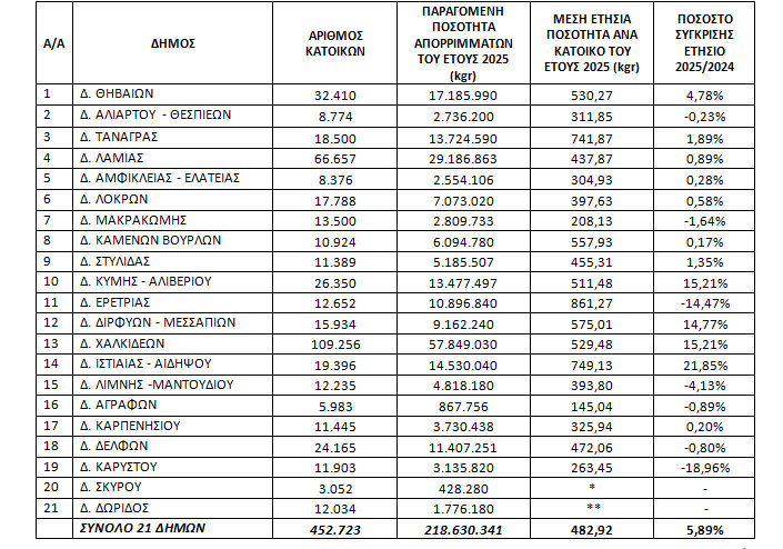Σύμφωνα με ανακοίνωση του Φορέα Διαχείρισης Στερεών Αποβλήτων (Φο.Δ.Σ.Α.) Στερεάς Ελλάδας, συνολικά 233.385.871 κιλά αστικών στερεών αποβλήτων παρήγαγαν το 2025 οι 21 από τους 25 Δήμους της Περιφέρειας που εξυπηρετήθηκαν από τις υποδομές αρμοδιότητάς του.