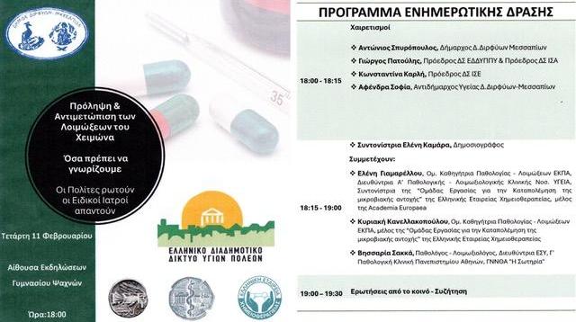 Δράση ενημέρωσης και ευαισθητοποίησης με επίκεντρο τις επιδημίες του χειμώνα διοργανώνει ο Δήμος Διρφύων – Μεσσαπίων, την Τετάρτη 11 Φεβρουαρίου, στις 6 το απόγευμα, στην αίθουσα εκδηλώσεων του Γυμνασίου Ψαχνών.