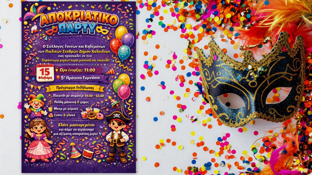 Ο Σύλλογος Γονέων και κηδεμόνων των Παιδικών Σταθμών του Δήμου Χαλκιδέων διοργανώνει αποκριάτικο πάρτι, την Κυριακή 15 Φεβρουαρίου, στις 11 το πρωί, στην αίθουσα εκδηλώσεων του 5ου Πρότυπου Γυμνασίου Χαλκίδας.