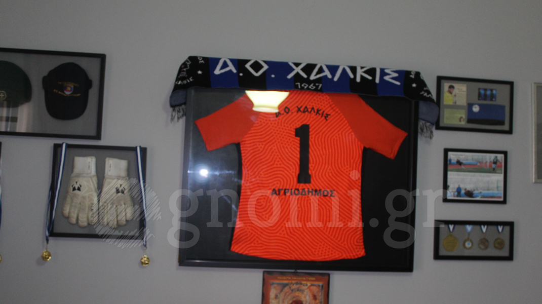 Η φανέλα με το Νο1 στην πλάτη και το κασκόλ του ΑΟ Χαλκίς, της ομάδας στην οποία ο Γιάννης ήταν εν ενεργεία γκολκίπερ (σ.σ. και την αγάπησε όλο λίγες) όταν άνοιξε φτερά και πέταξε στα γήπεδα του Παραδείσου.